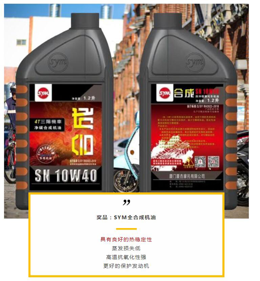 三等奖10名:京东购物卡500元*1+SYM全合成机油*2瓶